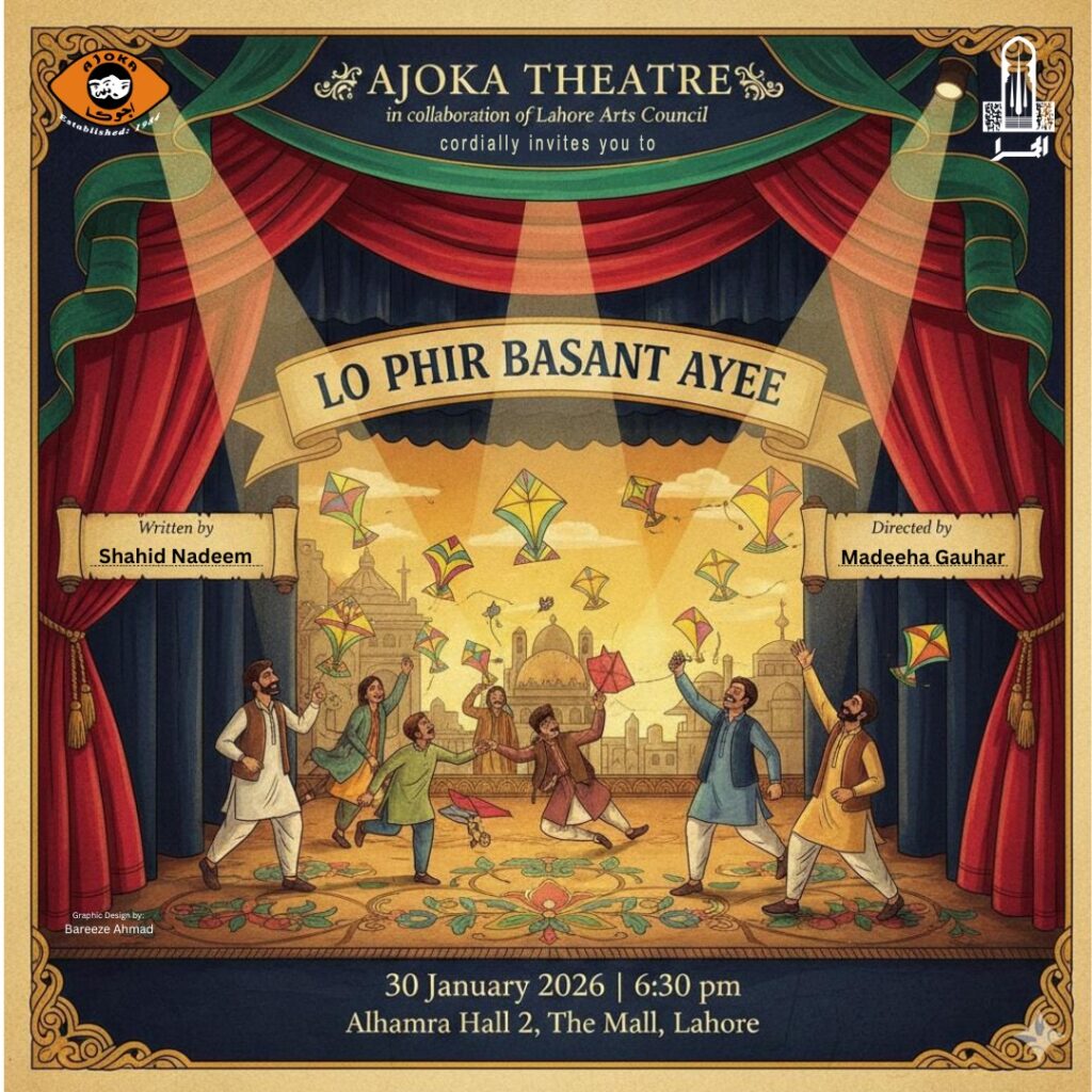Ajoka Theatre will stage its acclaimed cultural play “Lo Phir Basant Ayee” tomorrow, Friday, January 30, 2026, at Alhamra Hall 2, Lahore, followed by performances on February 1 and 2 at Government College University (GCU), Lahore, celebrating the return of the vibrant festival of Basant.