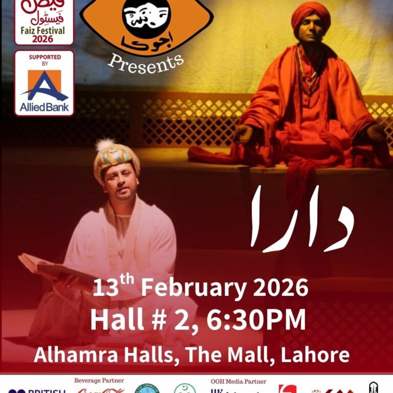 Ajoka Theatre will stage its internationally acclaimed play Dara at the 10th Faiz Festival on 13 February at Alhamra Hall 02. Faiz Festival is an annual cultural event held in memory of Faiz Ahmed Faiz, celebrating his legacy through literature, theatre, music, and dialogue.