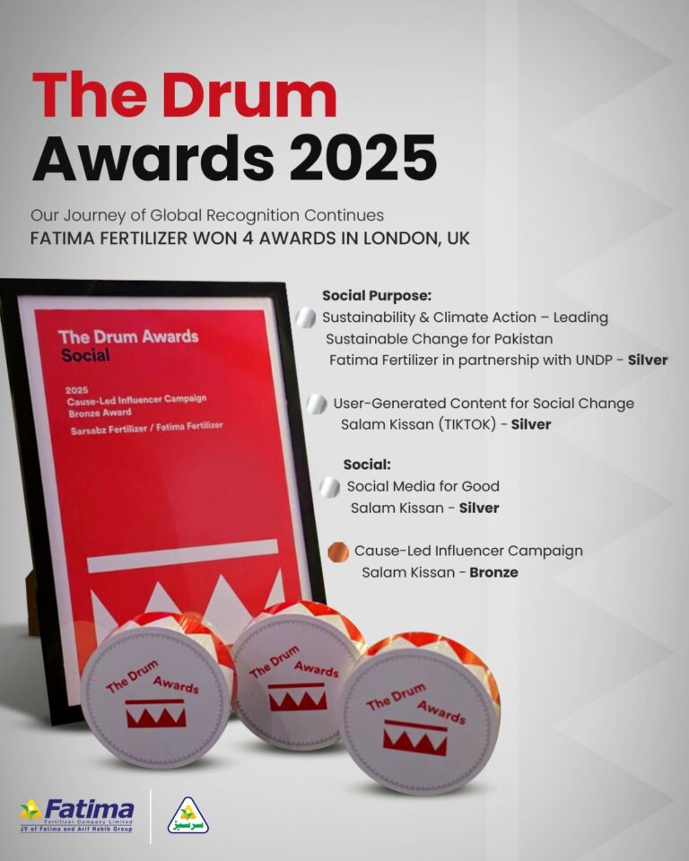 Fatima Fertilizer has received significant international recognition by winning four major awards at The Drum Awards 2025 in London reflecting impactful purpose-led communication for the Salam Kissan campaign and the company’s strategic partnership with UNDP.